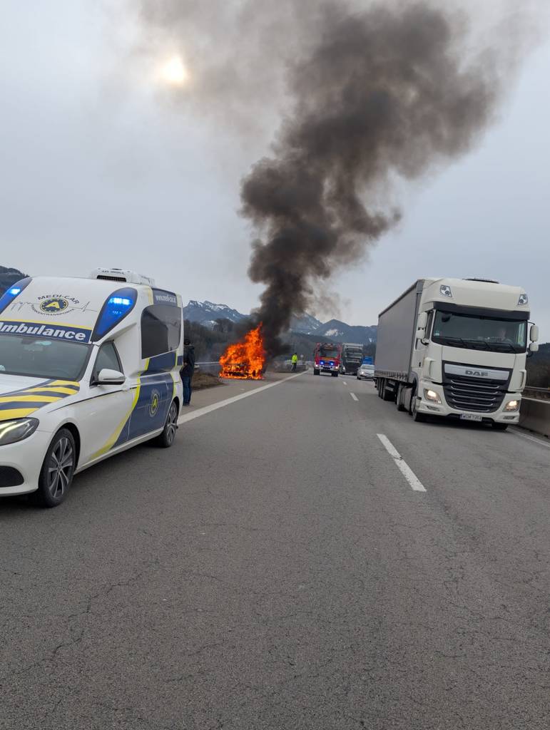 Bereits auf Anfahrt konnte das Meldebild durch die massive Rauchentwicklung bestätigt werden. Das brennende Fahrzeug befand sich zwischen den Anschlussstellen Bernau und Felden in Fahrtrichtung Salzburg. Der Brand konnte zügig durch die zwei PA Trupps der Feuerwehr unter Kontrolle gebracht werden. Kurzzeitig musste die Autobahn beidseitig komplett gesperrt werden.