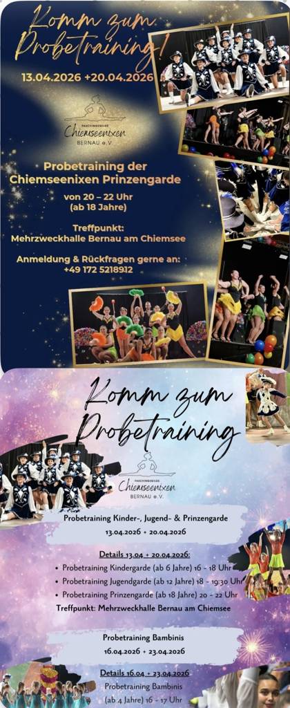 Bald ist es soweit und die Chiemseenixen starten in die neue Saison. Wie bereits angekündigt werden Probetrainings für die kommende Saison angeboten. Diese finden am 13.04.2026 und am 20.04.2026 für die Kinder- und Jugendgarde sowie der Prinzengarde in der Mehrzweckhalle statt, für unsere Bambininixen am 16.04.2026 sowie am 24.04.2026 im Kinderhaus Eichet (geänderter Ort!) in Bernau (jeweilige Uhrzeiten siehe Flyer).
