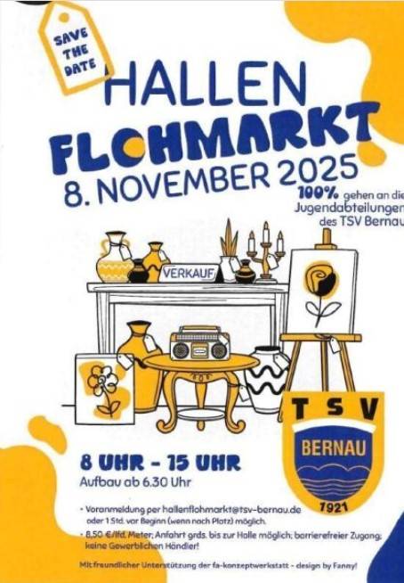 Am Samstag, den 08.11.25 findet wieder der große Hallenflohmarkt des Jugendfördervereins des TSV Bernau statt. In der Sporthalle besteht die Möglichkeit für über 80 Flohmarktler ihre Schätze an den Mann bzw. Frau zu bringen.
