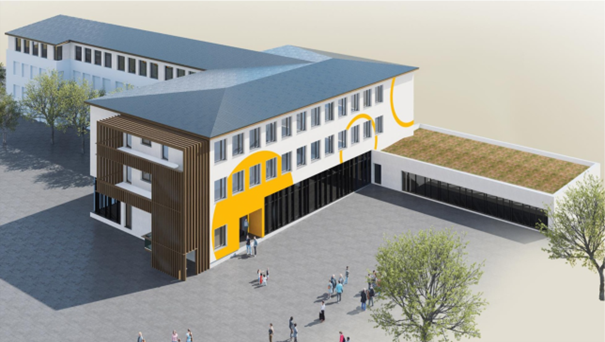 Bild: Mögliche Ansicht der Schule in Holzhybridbauweise - verputzt - Büro Sommersberger