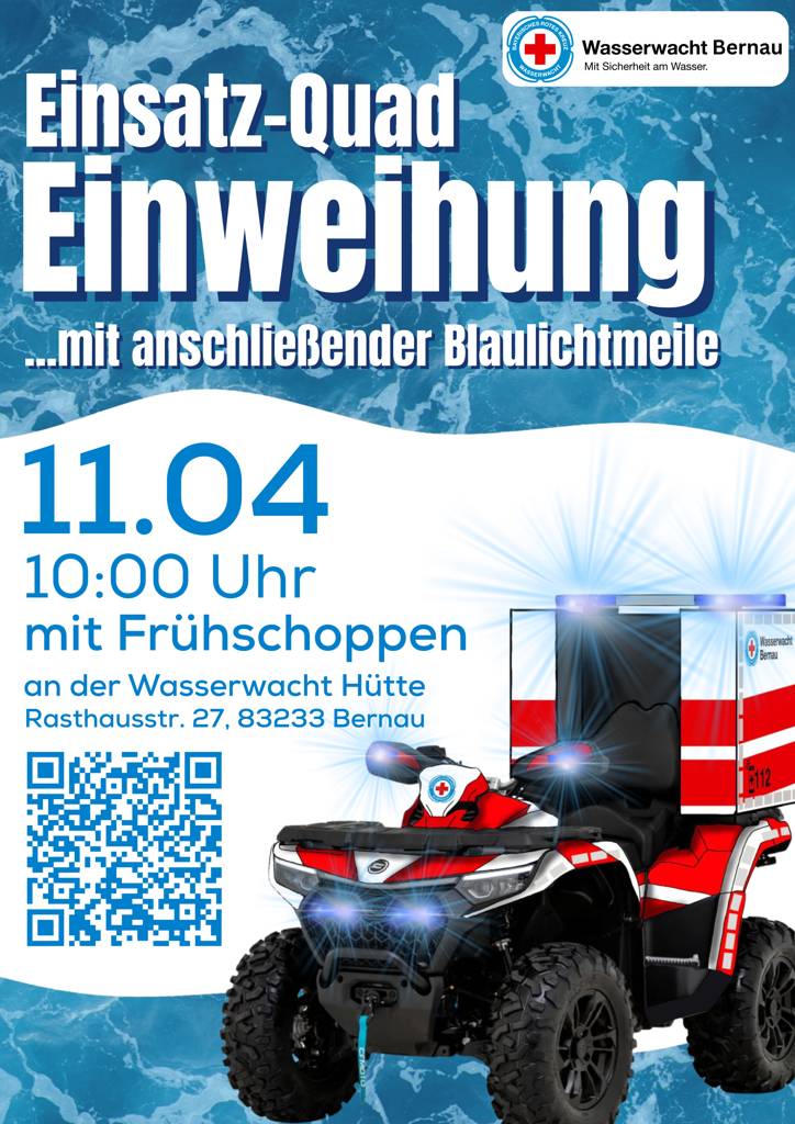 Die Wasserwacht Bernau lädt am Samstag, den 11. April, zu einem besonderen Ereignis auf die Festwiese in Felden ein: Neben der feierlichen Einweihung eines neuen Einsatz-Quads erwartet die Besucherinnen und Besucher eine große Blaulichtmeile mit zahlreichen Attraktionen für Groß und Klein.