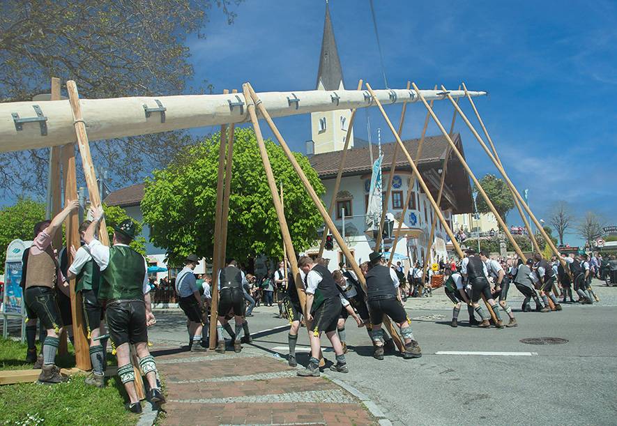 Ab 10 Uhr zieht der Festzug über die Priener Straße in die Ortsmitte ein. Am Kirchplatz wird der Maibaum anschließend traditionell mit viel Geschick und jeder Menge Muskelkraft mit den sog. "Schwaiberln“ Stück für Stück in die Höhe gestemmt.