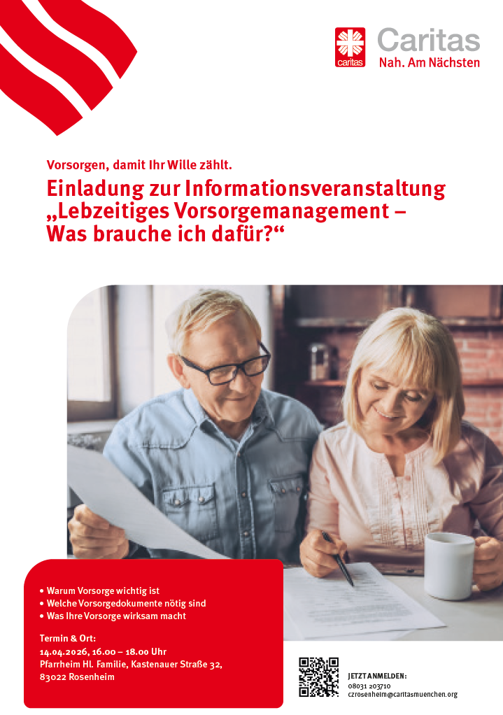 Gerade weil viele Menschen diese wichtigen Fragen aus Unsicherheit und / oder Unwissen aufschieben, ist die kostenfreie Informationsveranstaltung "Lebzeitiges Vorsorgemanagement – Was brauche ich dafür?" am 14. April im Pfarrheim "Heilige Familie" in Rosenheim ein hilfreicher und wertvoller Beitrag zur Selbstbestimmung und gesellschaftlichen Verantwortung.