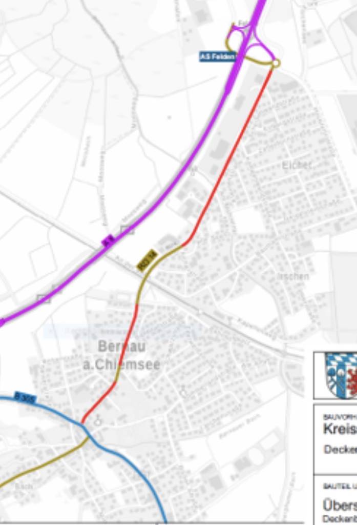 Wie bereits mitgeteilt, beginnt ab 20.10. die Sanierung der Chiemseestrasse. Vorhabensträger ist das Landratsamt Rosenheim zusammen mit der Gemeinde Bernau. Saniert werden die roten Abschnitte auf dem Plan; der gelbe Abschnitt wird nicht saniert oder gesperrt!