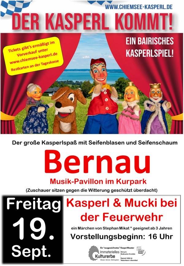 Am Freitag, den 19. September 2025, um 16 Uhr heißt es im Musik-Pavillon des Kurparks Bernau am Chiemsee: Wasser marsch! Kasperl stolpert zusammen mit seinem chaotischen Freund Mucki, dem arbeitslosen Osterhasen mit großem Herz, mitten in einen völlig verrückten Feuerwehreinsatz. Ob Mucki den Feuerwehrschlauch im Griff hat, darf bezweifelt werden – und als der Gartenschlauch der Hexe verrücktspielt, ist das Chaos perfekt. Das Publikum erwartet eine turbulente Familienkomödie mit einer riesigen Schaumparty, magischem Seifenblasen-Zauber und sogar einem Schneesturm mitten im September. Kinder ab drei Jahren dürfen lautstark mithelfen, lachen und die Geschichte aktiv begleiten. Erwachsene kommen genauso auf ihre Kosten, denn die Bayrische Kasperltour verbindet Tradition mit modernem Theaterwitz. Die Plätze im Pavillon sind überdacht, gespielt wird also bei jedem Wetter.