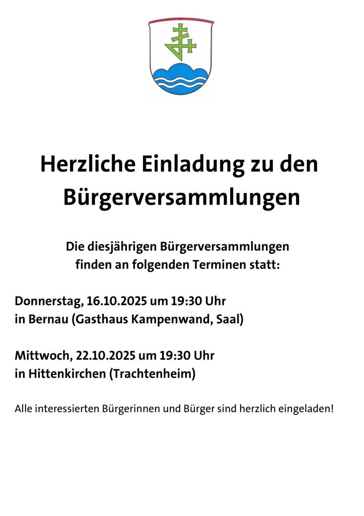 Die Bürgerversammlung in Bernau findet am 16.10.25 statt um 19:30Uhr im Saal des Gasthofes Kampenwand.